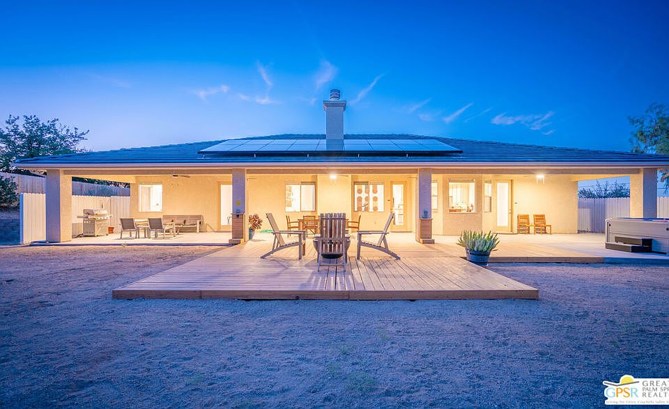 Unbeatable value in the heart of Joshua Tree! This enchanting 4-bedroom, 3-bathroom home sits on nearly an acre, blending timeless architecture with modern amenities for an unparalleled living experience. Recently renovated, this gorgeous property boasts high ceilings and an open-concept design, creating an inviting and spacious atmosphere. This is your dream retreat in the serene neighborhood of Upper Friendly Hills! Enjoy living in one of the best located neighborhoods in Joshua Tree, situated just a few blocks from the village and town center, you'll enjoy the convenience of local shops and dining while being only 10 minutes from the breathtaking landscapes of Joshua Tree National Park, perfect for exploring serene hiking trails and awe-inspiring natural beauty. Step into your private backyard sanctuary, where lush landscaping and a spacious covered patio set the stage for outdoor entertaining. Unwind on the brand-new deck with a hot tub, or cozy up by the firepit on cool desert evenings. Inside, a beautifully remodeled ensuite bathroom features modern fixtures, LED lighting, and thoughtfully placed switches for added convenience. Additional upgrades including epoxy-painted cabinets and floors, powered blinds, dual Navien tankless water heaters, house fully vented for a swamp cooler, and a propane-plumbed fire pit and barbecue enhance both style and functionality. Security and comfort are top priorities, with a SimpliSafe alarm system, Ring security cameras, and video doorbells ensuring peace of mind. A gated entry leads to a spacious 3-car garage with EV charging and RV access, offering ample storage for all your recreational gear. Plus, with 20 solar panels on a transferable lease, this home is as eco-friendly as it is luxurious. Perfectly suited for short-term rentals, this home offers a lucrative opportunity for investors or those seeking a hassle-free Airbnb experience. Furnishings are negotiable! Providing meticulous attention to detail and a host of amenities designed to impress, this gem is ready to welcome you home to the enchanting beauty of Joshua Tree. Whether you are looking for a primary residence, vacation getaway, or short-term rental investment, this beautifully designed property offers a seamless blend of comfort, style, and opportunity. Don't miss your chance to own a slice of desert paradise schedule a showing today!