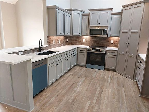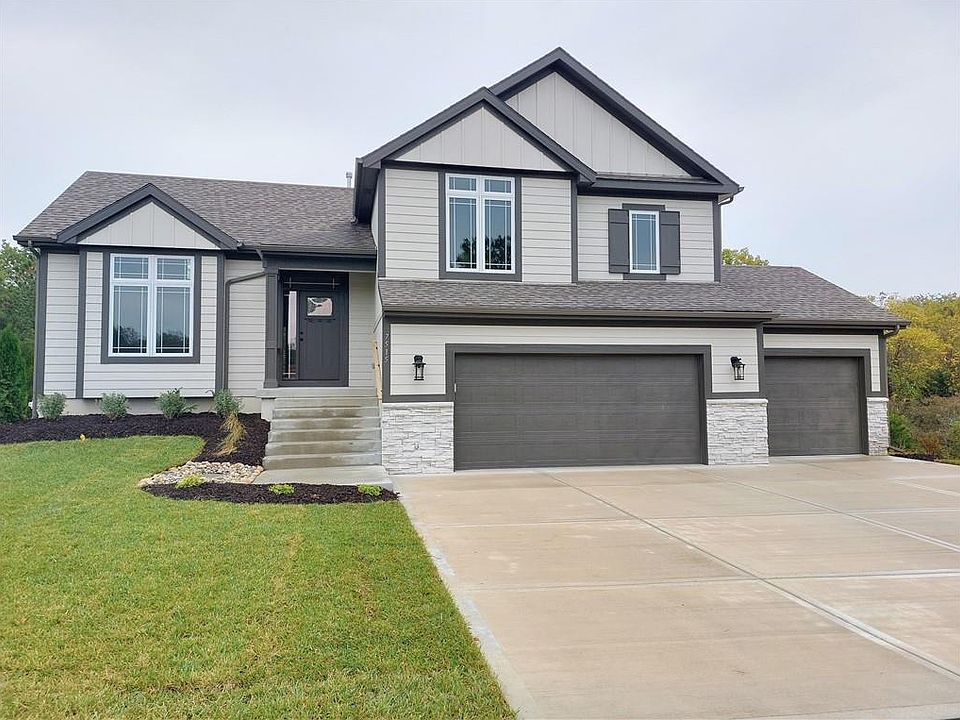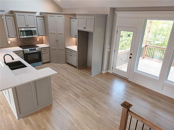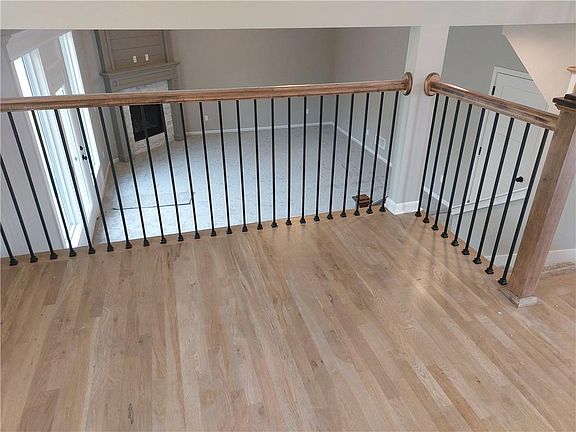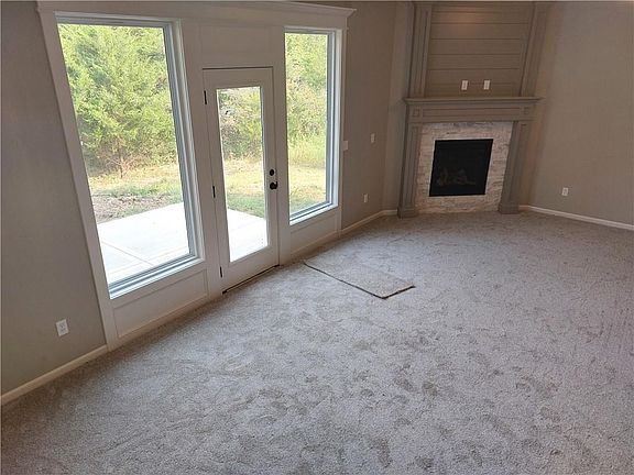 Ready for paint touch-up and final clean! This same floor plan is on Lot 137. Nestled on a private cul-de-sac and backing to serene trees and green space, this home offers both privacy and natural beauty. Located in the county—**no KCMO “E” tax**—you’ll enjoy added savings while still being close to everything. The 12x12 covered deck includes stairs leading down to a spacious patio, perfect for outdoor entertaining. Inside, the open-concept layout features solid hardwood flooring throughout the main level, and stunning granite and quartz countertops in all kitchens and baths. The finished walk-out lower level includes a spacious family room that opens to the patio. The primary suite boasts a box-vault ceiling with gorgeous stained beams and a large walk-in closet. Additional highlights include a walk-in pantry, rounded drywall corners, and an ultra-quiet dishwasher.