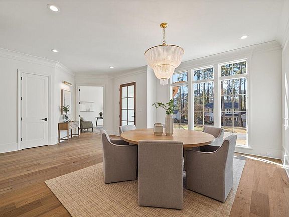 Located in North Raleigh in the highly sought-after neighborhood North Ridge, recently built by Raleigh Custom Homes. This home features an open concept plan with a formal dining room and an office/study. The family room includes a gas fireplace with built-ins and flows out to the screen porch through a wall of sliding glass doors. The chef style kitchen includes a huge island, custom cabinetry, top-of-the-line Jenn Air appliances, 8 burner gas range, wall ovens, and a walk-in pantry. The primary suite and guest suite are located on the main floor. Upstairs features 3 more bedrooms, a game room with a wet bar, a large exercise room, and finished flex spaces. The outdoor living space is equipped with Phantom screens, Infratech heaters, and a grilling station- all of which look out to the saltwater pool/spa. Custom features boast throughout this home.