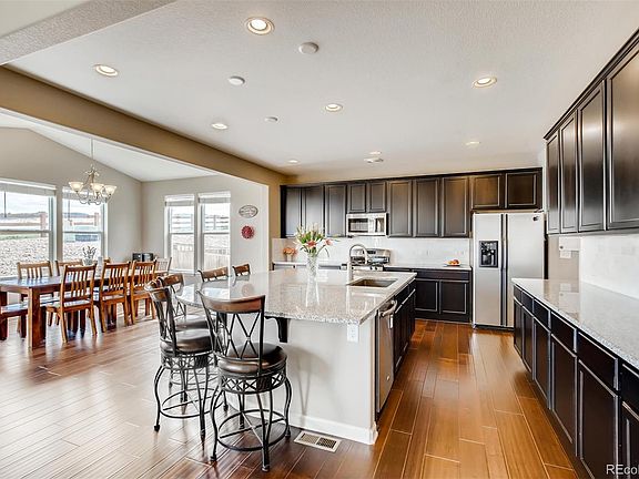 This beautiful home overlooks the Hidden Mesa Open Space, has a private spacious backyard, and has many upgrades including a large Sunroom, 3-Car Garage, and a spectacular Gourmet Kitchen. This dream kitchen includes gas range, walk-in pantry, brushed stainless-steel appliances, upgraded hardwood floors, Italian marble tile backsplash, and an absolutely stunning granite island with enough space to seat 6. The kitchen opens up into the Great Room which also includes a Fireplace with blower and plenty of space for entertainment. The large Master Suite has a tray ceiling, a 5-piece bath, walk-in closet, and an amazing view of the sunset over the hills. There are 3 more spacious bedrooms that share the dual-vanity hall bath and open into a large loft or playroom. Near shops and restaurants in both Castle Rock and Parker. This one won't last long since houses on this side of the street backing to Open Space do not come up for sale very often, so make an offer before it's too late!
