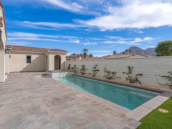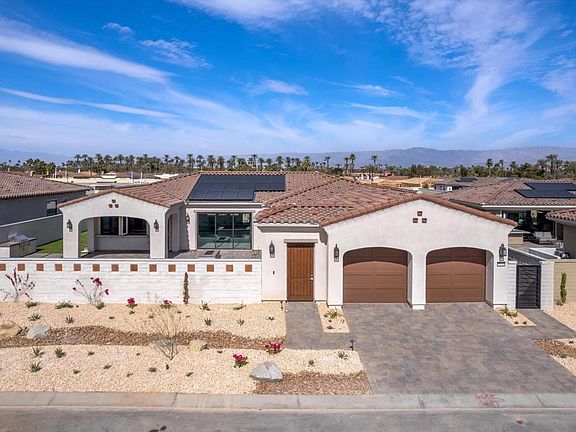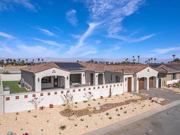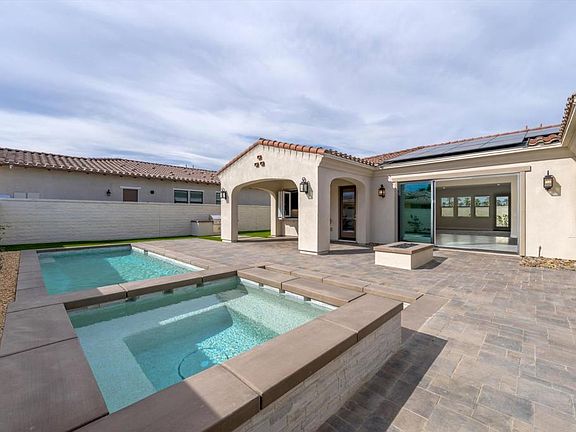 New construction, never lived in, move in ready!! The layout and features of this beautiful property are perfect for entertainment. The grand open floor plan opens to a front loaded pool with waterfall, a separate spa, firepit, built in BBQ and a bar covered patio. The appliances are top of the line. This house is absolutely stunning inside and out with fabulous views of the mountains. 3 bedrooms, 3 full baths, 1 half baths, a flex space and owned solar. A Spanish exterior design with a covered portico and a clean stucco finish. The back and side yard are well manicured and low maintenance. Near spectacular golf courses, high end shopping, dining and entertainment opportunities.