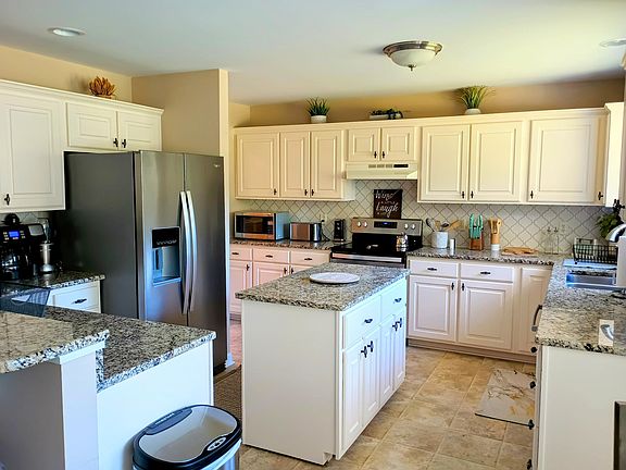 KITCHEN: The beautiful large kitchen has an island, plenty of counter space, a sink overlooking the backyard, a side-by-side refrigerator, a pantry closet, and a utility room with a washer & dryer(as-is). The refrigerator is equipped with an ice maker and water filter, there is also a microwave and toaster oven.