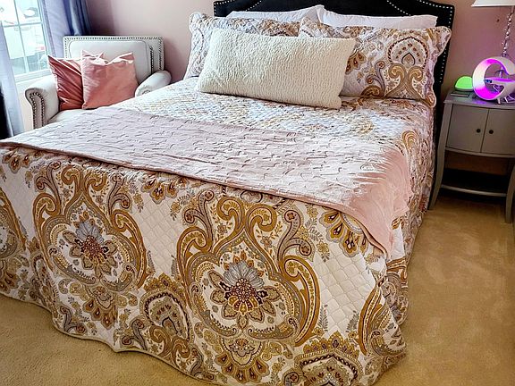 INDOOR LIVING: The home has three bedrooms and two full baths. The primary bedroom has an en suite bathroom and access to the back patio. Each bedroom has closets with shelving. The living room boasts a gas fireplace and access to the back patio. The home is partially furnished: sofa, two living room chairs, an ottoman, and a queen-sized bed with frame and mattress.