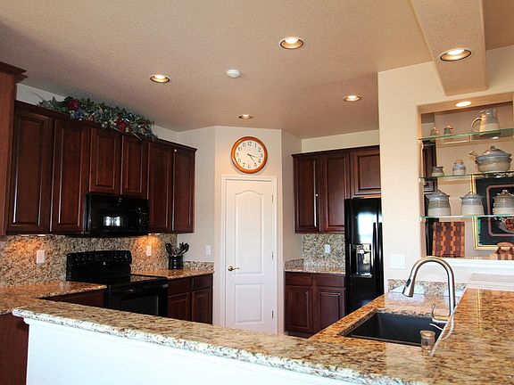 Stunning views! Welcome to the place you'll love to call home! Custom Cherry hardwood flooring throughout the main level. Kitchen w/ slab granite, custom Cherry cabinets, island w/ counter bar, appliance garage, recessed lighting, corner pantry, & black appliances. Corner dining area offering stunning views. Great room boasting hardwood flooring, gas fireplace w/ granite surrounded, entertainment nook, & walks-out to an extended deck. Office w/ french doors. Master suite w/ great views, a 5-piece bath w/ ceramic tile counters, garden tub, separate shower, & walk-in closet. Finished basement featuring surround sound, projector, & wall-sized screen. Walk-out to another Trex deck, covered. 3 oversized bedrooms w/ walk-in closets as well as a full bath w/ a double sink. Custom window treatments & blinds throughout. Large 3-car garage. 3 inch baseboards, valances, attractive lighting, & archways add to the distinguished ambiance. Near trails, parks, D-20 schools, & all conveniences!