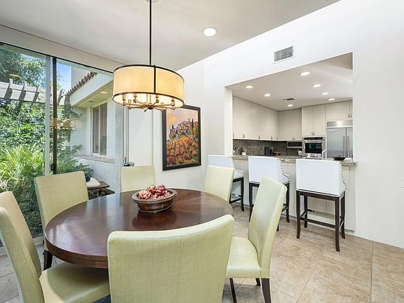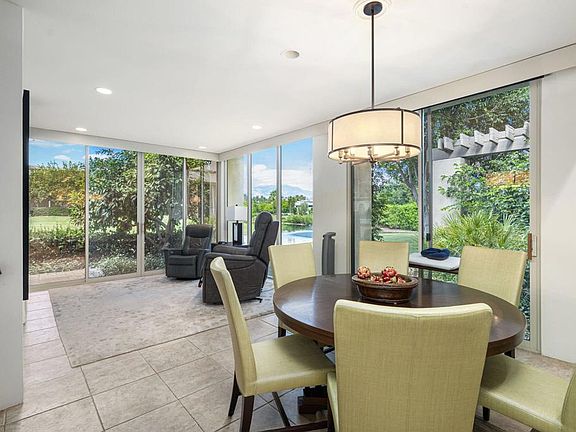 Accessed through a lushly landscaped courtyard is this B' Plan Cottage offering approximately 2,378 square feet of living space. Located within an enclave referred to as Cottages East where 51 homeowners share a large common pool/spa with outdoor living environment plus a secondary spa along the fairway which is within a five-minute walk of this Cottage. Typically, each building is a cluster of six Cottages, either two- or three-bedroom units and each are accompanied by a dedicated enclosed two-car garage plus a separate enclosed golf cart garage. These condominiums reflect a California Hacienda-style architecture that illuminates the charm of the carefree lifestyle enjoyed by homeowners. Dispersed throughout the enclave each building offers greenbelt views; while some are set along fairways or lakes others experience mountain vistas. The floor plan of this Cottage offers two stately guest ensuites each with an updated bath, plus a powder room with custom linen closet. The one-level floor plan does include a step-down living room with center-pointe fireplace, a walk-up bar with under-counter wine cooler, and sliding glass doors that allow patio access to the views of the greenbelt with lake feature. The updated kitchen has both a center-island and a peninsula that offer abundant storage, stone counter-tops, appliances, and a custom designed desk wall unit. The Cottage was expanded off the dining room to create a cozy den area.
