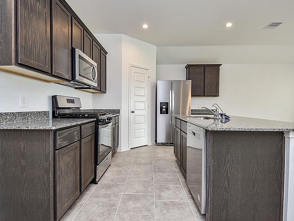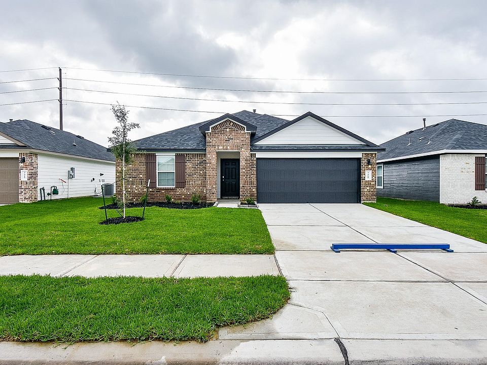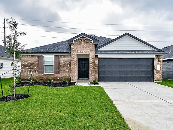 One story home, 4 Bedroom/ 2 Bathroom, Cali floorplan! Home is sure to please with its open concept kitchen/dining combo overlooking the living room with 15'' ceramic tile flooring throughout! This beautiful kitchen includes all stainless-steel appliances, large walk around island, granite countertops and purified Reverse Osmosis System. The spacious Owner's Suite features vaulted ceilings, his and hers private sinks, oversized shower, with an immense walk-in closet. Upgraded brick and stone elevation plus an oversized covered patio! Included features: Blinds throughout, Full sprinkler and landscape package (front and back yard), Smart home security automation and MORE!! NOT IN FLOOD ZONE! Amenity center with pool, Resort style slides, Pavilion, BBQ pit, Playground, Soccer field and MORE!