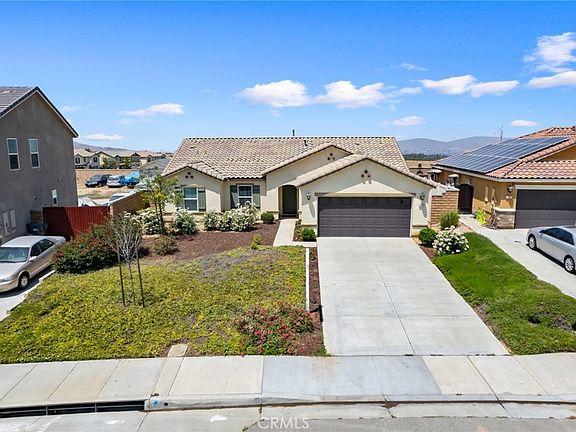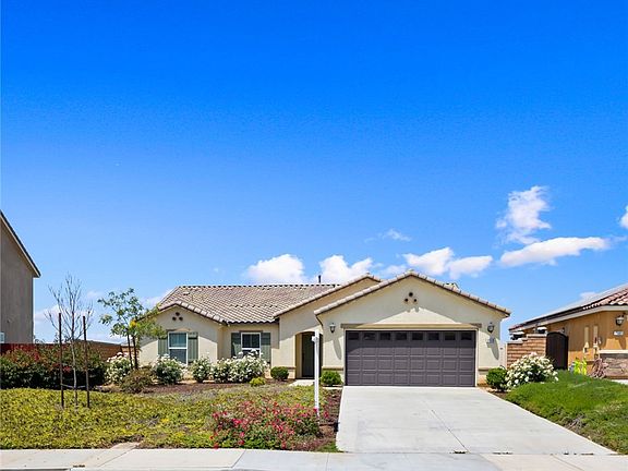 Welcome to 7519 Silverspot Rd in the Silver Spring Mountain Ranch community of Riverside, CA. This newer KB home offers a spacious lot for the area and features a single-story layout with 3 bedrooms and 2 bathrooms. The open floor plan creates a welcoming atmosphere, perfect for families.