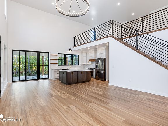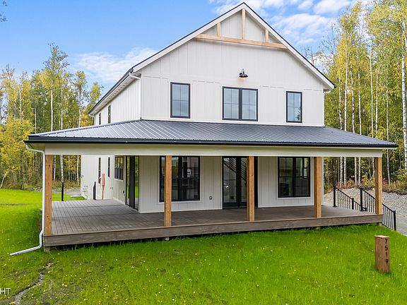 This barndo-style farmhouse is 2-story featuring 4 bdrms, 2.75 ba., & a 2 car gar. w/1 oversized door for RV's. Situated near the bluff above Settlers w/sweeping views from Pioneer Peak to Anchorage. All the amenities including 20ft ceilings, in-floor heat, HRV, quartz counters, huge corner wrap around covered porch, brick gas fireplace, a loft overlooking the great room. (See Supplement).This stunning new home is 5* energy rated and is located in a quiet neighborhood situated near the bluff above Settlers Bay with sweeping views from Pioneer Peak to Anchorage. These views can be taken in on the hugejaw-dropping corner wrap around covered porch. This home has all the desired features including 20ft ceilings, in-floor heat, beautiful waterproof LVP flooring, quartz countertops, 2 pantries, plenty of closet space, and a master with walk-in closet and en suite with stunning tile work. It has a loft with custom built-ins that overlooks the living/dining area that boasts floor to ceiling windows which offers abundant natural light. The brick gas fireplace and custom fabricated staircase railing are more stunning features in the great room.