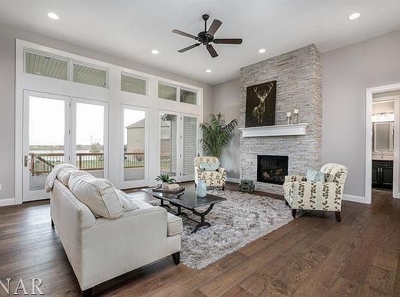 New Construction ranch at Trails on Sunset with lake view. 4 bedroom 3.5 bath home with look out basement windows, open kitchen and family room layout, private master bedroom and bathroom, and finished family room, bedroom and bathroom in the basement with lots of space for storage.