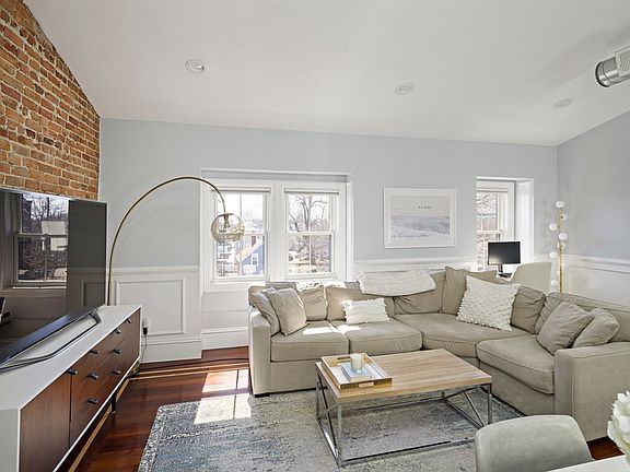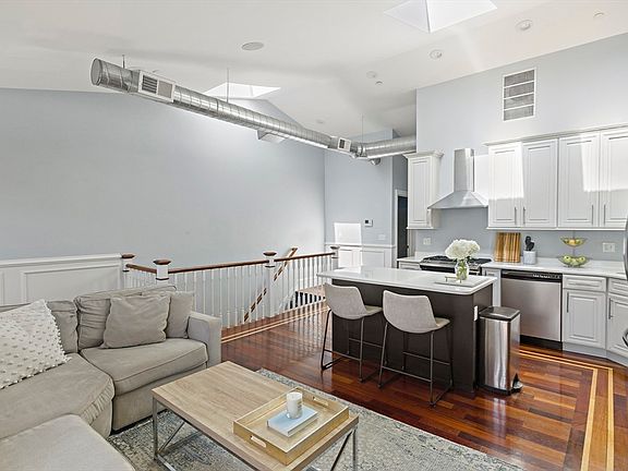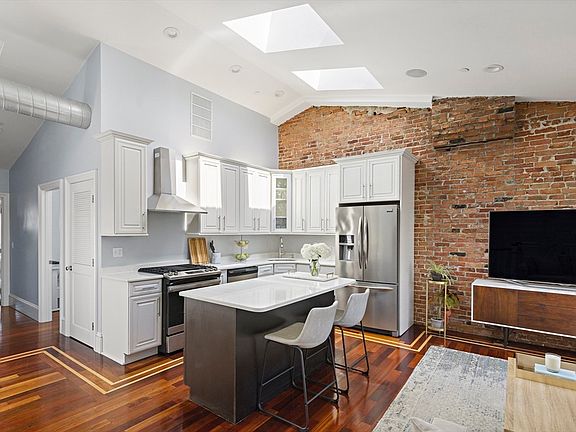 Gorgeous, sun-filled 2-bed, 2-bath penthouse condo in City Point. Open-concept living & kitchen area boasts soaring vaulted ceilings, multiple skylights & exposed brick accents. Modern kitchen features white cabinetry, quartz countertops, stainless steel appliances + an island w/ a breakfast bar. The primary suite features a spacious double-door closet & a beautiful paneled accent wall, complete w/ an en suite bath w/ marble tile & radiant heated floor. A generous, queen-sized second bedroom w/ a double-door closet & beautiful exposed brick. Brazilian Cherry hardwood floors throughout, in-unit washer/dryer, built-in speakers & a large private back deck + exclusive roof rights. Located on one of South Boston’s most picturesque tree-lined streets, this brick building is directly across from the beautiful Lincoln Square Garden. Plus, just a few blocks from East Broadway restaurants, the beach & bridge to Seaport. Don’t miss your chance to own this one-of-a-kind, centrally located gem!