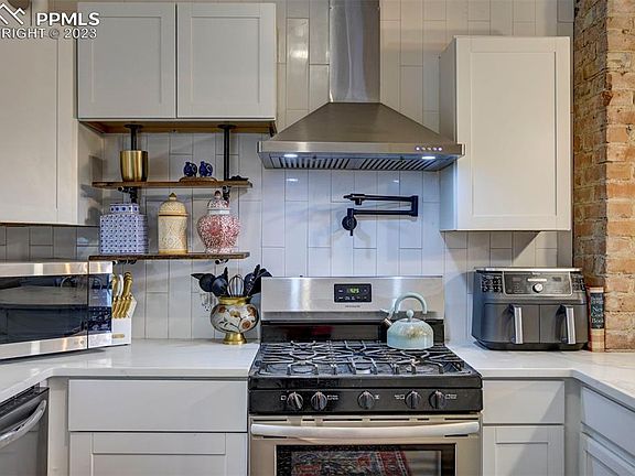 updates! This 2 bed with basement flex space is a great downtown home. The kitchen is new quartz countertops with all stainless steel appliances and, of course, a large farmhouse sink and gas stove! Two bedrooms upstairs with full bath and a half bath downstairs. New waterproof LVP throughout. Equidistance between memorial lake and all of Colorado Springs best restaurants downtown, you could not ask for a better location in Colorado Springs. The huge lot size is just a plus! The back yard has views of the peak, is fully fenced and primed for back yard BBQs. And finally to add to the perks of this charming little gem, this home has a 2 car detached garage with its own breaker box and 240v that could be easily turned into an ADU, workshop or full garage. Home can come furnished or unfurnished.