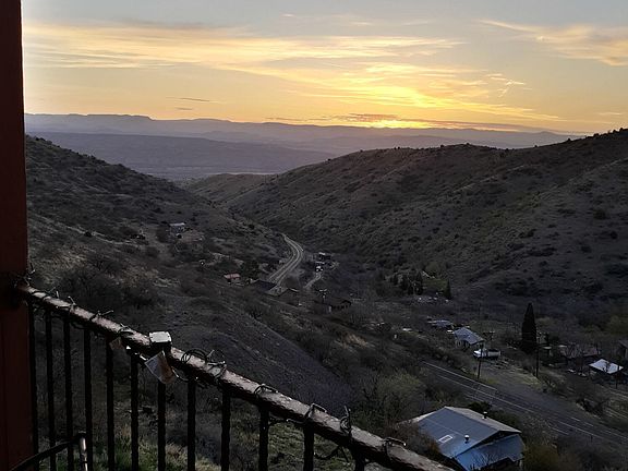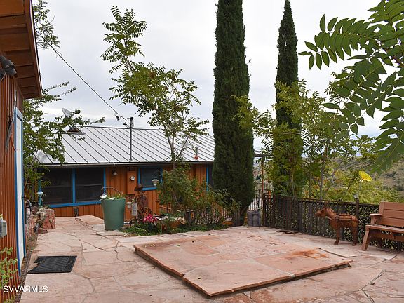 SOMETHING SPECIAL! From the entrance patio this home looks like an extremely private well-maintained vintage miner's shack. A miner's shack with immense decks and a custom metal roof, but still. We're guessing from the concrete and the wood that she WAS once a simple miner's shack. Go over the flagstone patio to the front, admiring the huge deck and the shed and whimsy garden up above, the gorgeous custom metalwork railings. Recently surveyed! THEN you go inside and get your socks knocked off. Do yourself a favor right now and don't read any further and don't look at the pictures - just call for a showing and enjoy the surprise of walking into this gorgeous home for the first time. HA! You read on. OK. I'll tell you about it, since you insisted. Click ''MORE,'' please. When we go inside, ignore the living room and those luscious copper ceilings at first. Let's go into the kitchen, OK? Boy oh boy if floors could talk! These floors might be the original miner's shack wood floors. Look around and enjoy the genuine slab granite countertops, the included stainless steel appliances, the custom knotty alder cabinets. Imagine the feasts that you will create in this kitchen! NOW you can go into the living room. Look up, gasp at the copper ceilings, marvel at the view from that deck. Let's go into the office, off of the living room. Gas fireplace, wrap-around windows, leaded glass doors, an exit to the outside path leading down to the lanai. Wander back through the living room into the Master bedroom. Notice the reading nook, the wrap-around windows with real wood plantation shutters, the skylights. Now to the Master bath! Nice big custom closet, Western Heritage sink, professionally done shower, poke your head into the laundry room which is really nothing special but has a door out to the back yard. Back to the living room and down the steps to the lower floor, often used as an in-law suite since there are 2 outside private doors. A quiet bedroom with a view of the Old High School, then a huge room with a big closet, then the cutest full bath you ever laid eyes on, possibly using parts of the original miner's shack plus another Western Heritage sink. Out of the bathroom, please, back into the huge room. What the heck are you going to do with this room? Have fun deciding! I'm calling it a bedroom, and it could very easily be a home theatre, or exercise room (which it is currently) or meditation room, or a wine cellar because it's mostly underground, whatever your heart desires, my pretty! Go past the inside mechanical room to an outside covered patio, then to the lower deck and then to the lanai. "But wait!" you ask. "The listing says that this home sits on point-one of an acre. This is WAY more than that!" Good eye, my friend. There's an almost full acre extra surrounding the home, leased from Verde Exploration for $1200 a year. It's a sweet deal, and very common in Jerome to lease our yards from Verde X. A new buyer will need to renew the lease with Verde X. Recently surveyed, with a deeded driveway easement to the house from Gulch Road. What else do you need to know? 2 rescue greyhounds and 4 or 5 rescue cats live here, so if you're allergic please pass. The upper deck was just recently professionally replaced with TimberTech decking. October 2022 inspection report attached in "Documents." It is awesome, and shows how well-maintained this lovely home is. NO HOA!