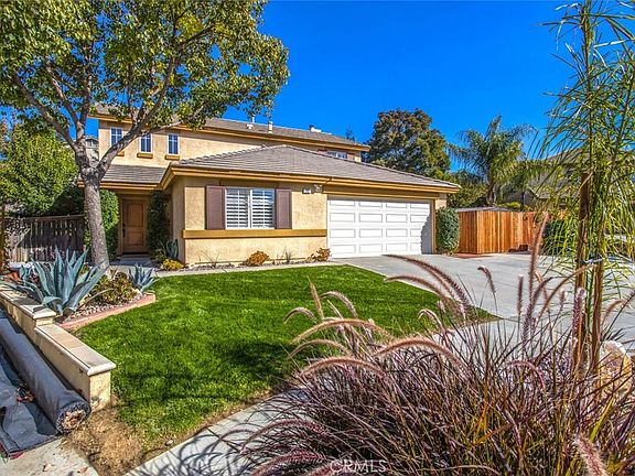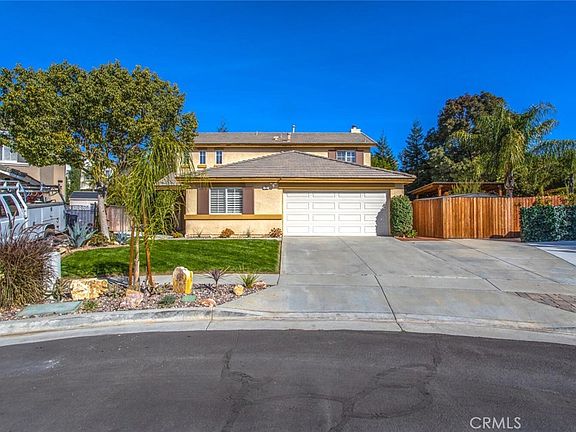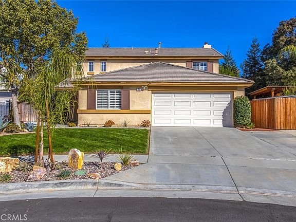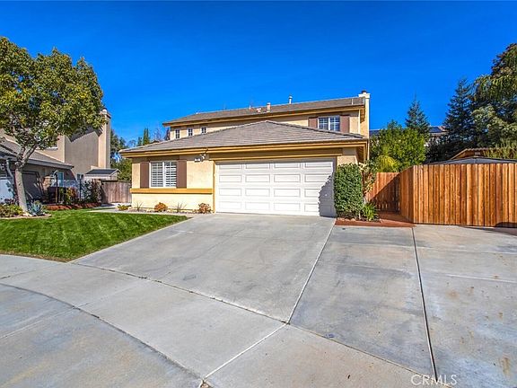 Do you need space to entertain family and friends? Look no further. This is outdoor entertaining at it's finest! This home has a large backyard with an approximate 14' x 17' covered patio area with lighting, ceiling fan, a built in barbeque and refrigerator, walking paths, fire pit area, additional patio area (approximately 65 sq ft) with an outdoor TV, ceiling fan, lights, stereo, sink, and hammock and still enough lawn for the kids or pets. The downstairs features a living room, dining room, separate family room with a ceiling fan and fireplace, kitchen with stainless steel appliances, pantry, island, direct garage access, and DOWNSTAIRS BEDROOM and bathroom. The upstairs features the primary bedroom with a ceiling fan and en-suite bathroom with dual vanities, separate water closet, walk-in closet, and an additional closet in the bedroom with closet organizers in both. The laundry is upstairs with two more bedrooms, one with a closet organizer, ceiling fans and the third bathroom. Other features include plantation shutters throughout, whole house fan (very energy efficient), tankless water heater, Ring cameras, Nest thermostat, RV parking, cul-de-sac location and LOW Mello-Roos taxes, and NO HOA. Most of the interior has just been freshly painted. Easy freeway access, conveniently close to the elementary school, middle school, high school, shopping, golf, and parks. All information deemed reliable. Buyer and buyers agent to verify.