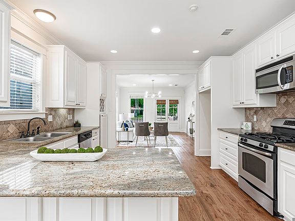 Extra parking padDedicated wine rackBuilt-in microwaveGas stoveGranite countertopsIsland seatingReal wood floors