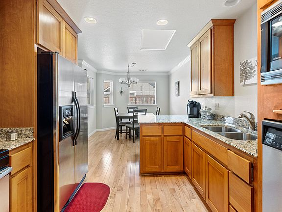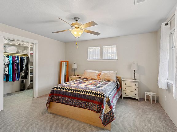 Welcome to Kinsington Court! This established 55+ community beckons you home. The beautiful 1,572 square foot, 3 bedroom, 2 bath home on a corner lot was built in 2008. Features include spacious living room with gas fireplace, vaulted ceiling, maple hardwood flooring, new carpet in bedrooms, kitchen with granite counters, natural gas range/oven, pantry and snack bar. The primary bedroom features a walk in closet, large master bath with walk in shower, and light and bright windows. The pantry is generous and the laundry room includes storage cabinets. Enjoy the covered front and back patios with mountain views! Great location, close to town, shopping, and downtown. HOA covers water/sewer, landscaping, roofs and exterior paint.