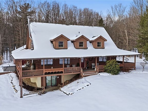 Welcome to The Lodge at Mountain View Meadow (7520 W Hollow Rd) and the Carriage House (7522 W Hollow Rd), both active short-term rentals. The Lodge sits on 28.5 acres and features 4 bedrooms, accommodating up to 12 guests, with an open-concept kitchen and entertainment space on the 2nd floor. A wraparound porch provides the perfect place to relax and enjoy stunning views. The 55x62 indoor arena includes 7 stalls, 4.5 acres of pasture, eight dog kennels, and a 10x15 bonus room, while the pond and surrounding trails can be enjoyed by both guests and owners. The Carriage House, situated on 4.56 acres, is a stunning 2012 build offering 5 bedrooms, each with en-suite bathrooms, along with a lower level featuring a sauna, massage room, and gathering space, plus a wraparound deck with spectacular views. All contents of both properties and the barn will convey with the sale, making this an ideal opportunity whether you are searching for your dream home, a micro-event venue, or a sprawling STR estate that can host up to 22 guests near skiing, hiking, wineries, and the many attractions the Finger Lakes has to offer. Did someone say cost bonus depreciation? Make your 2026 dreams a reality! 7522 W Hollow Rd / tax map no. 323889-193-000-0003-022-112 is included in sale. Square footage, # of beds/bath, acreage and total taxes reflect total of both properties.