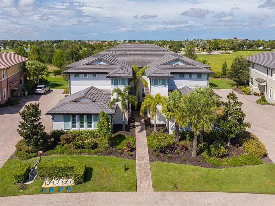 Welcome to Clubside at Lakewood Ranch Country Club East where living is care free and luxurious! This 3 BR plus den, 2 BA, 2 car garage gorgeous second floor "Coach Home" comes equipped with an elevator making the trip up so convenient. Enjoy peace and quiet with no neighbors above you and maximize the golf course and nature views through the large windows and wall of sliders leading out to the oversized covered lanai, a great place to hang out and entertain! This unit is the Montserrat model built by WCI and offers a true split floor plan with the master at the back with the views and the secondary bedrooms up front. This home is stylish and highly upgraded with designer coffered ceilings, wall panel design in the hallway and crown molding throughout the entire home including the bathrooms. The flooring is designer tile through main living spaces with upgraded wood flooring on the stairwell including upgraded wood railings with wrought iron and double door entry to den with carpet in the bedrooms. The home has been meticulously cared for and offers a gourmet kitchen with granite counters, tile backsplash, under cabinet lighting, stainless steel appliances with gas range, large pantry closet, tons of cabinet space, breakfast bar with seating for three and connected to a breakfast nook for more seating. The luxury master suite offers comfortable space, privacy, access to the lanai, on suite bath with dual sinks, private water closet, large step in tile shower with high end glass doors, linen closet and walk in closet. The secondary bedrooms are both spacious and share the guest bath. Descending to the 2 car garage is where you will find the tankless water heater (gas supplied), epoxy coated flooring and room for some additional storage. The main home also offers lots of extra closets for storage and a great laundry room with a laundry sink and storage cabinets. This home offers maintenance free, lock and leave living in a gated resort type community and includes 3 community pools and the clubhouse and fitness center at the Retreat which is close proximity to Clubside. There is optional membership in the Lakewood Ranch Golf and Country Club for social, sports and/or golf membership. Note that there is currently a waiting list only for the golf membership. The furnishings in this beautiful home are being offered as an optional separate transaction. Country Club East offers a convenient location to Lakewood Ranch Main Street, the UTC shopping and dining mecca, about 30 minutes to downtown Sarasota for cultural events and approx. 40-45 min to Lido Beach or Siesta Key. See this home today!