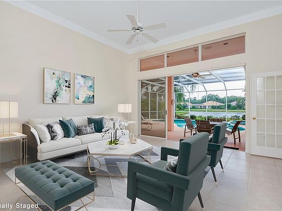 *** VACANT AND EASY TO SHOW! FRESHLY PAINTED! MOVE IN READY! *** Rare stunning lot with beautiful Water Views! This popular Kensington floor plan by Anchor Builders offers space, privacy and flexibility. 3 bedrooms, 3 full bathrooms PLUS Office/Den. Custom built, well maintained and updated! NEW TILE ROOF 2018! Gourmet Kitchen: Stainless appliances, granite, backsplash, tile, and wet bar. Breakfast nook has an aquarium window overlooking the pool and the lake views. Two water heaters: one is electric, one is natural gas. Decorator colors and plantation shutters. Custom built-in closets. Split plan with private master suite. Spacious master bath remodeled: granite counters, spa tub and separate shower. Gas heated pool & spa and outdoor kitchen. The lanai offers the opportunity for al fresco dining under the stars! The desirable community of Eaton Place in University Park is a pleasure for its location: so close to the Clubhouse, which is the social hub of University Park Country Club! University Park is an award winning community offering 27 holes of championship golf, 11 Har-Tru lighted tennis courts, a State of the Art fitness center and first class dining. All within minutes of I-75, the UTC shopping mall, restaurants, airport and the World Class Nathan Benderson Rowing Center. Easy access to downtown Sarasota and area beaches. You will love seeing this exceptional home! One or more photo(s) has been virtually staged.