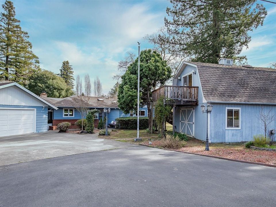 Charming 1958 one story corner home on .4775 acres down a country lane minutes from downtown Sebastopol. The lush lot surrounds the home and a detached barn-style garage. Living room overlooks expansive garden and backyard and has a fireplace with gas insert to warm it up on those chilly mornings and nights. Cozy dining room with greenhouse window is open to living room and kitchen. Kitchen was remodeled by previous owners and has stainless appliances including a gas range, built-in oven, refrigerator and recessed lighting. The covered breezeway between the home and the attached 2 car side by side garage was extended and enclosed to make a spacious sunroom plus 1/2 bath. There are 3 Bedrooms and 2 full baths including primary suite with dressing area and walk-in closet. Primary bath has stall shower and hall bath has a whirlpool tub. Rich oak hardwood floors throughout have just been refinished. The detached garage was built to be a workshop on the ground floor and the upstairs served as a dream 18' x 23' art studio/ & craft room. Assessor's tax record shows 1218sf + approx. 360sf Sunroom + approx. 414sf Room above detached garage = approx. 1892sf total. Whether for your primary home or a getaway from the city life, you'll love this peaceful slice of heaven in Sebastopol.
