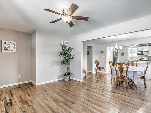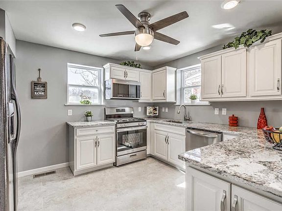 Home has been COMPLETELY renovated within the last year. Gorgeous!! Mainly brick home. Hardwood flooring in living room & dining room. Living room with fireplace and beautiful stain glass windows. Kitchen features white cabinets with crown molding, granite counter tops, stainless appliances and recessed lighting. Main floor bathroom with ceramic tile surround/ tub shower combo, vanity with granite top. Basement is finished and features: 3rd bedroom, family room, rec area, office, full bathroom with large vanity with granite top. Ceiling fans in several rooms. Beautiful 2 panel white doors throughout. Partially fenced yard. Covered front porch and rear porch. Rear patio area great for BBQ. Utility/storage shed in backyard. Long Newer driveway. 200 Amp electric.