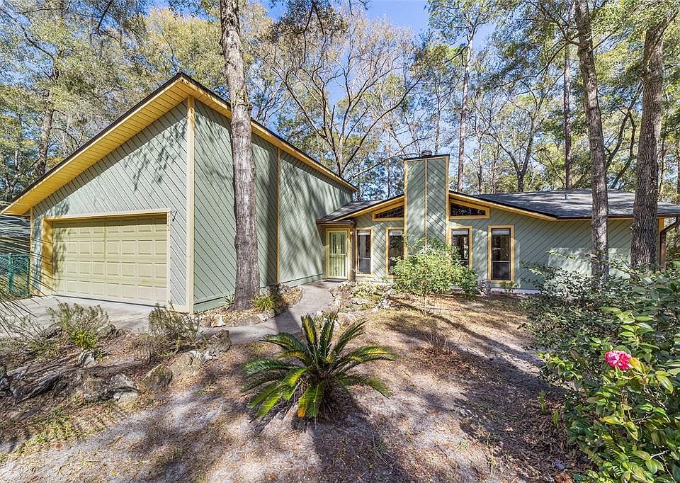 One or more photo(s) has been virtually staged. PRICE REDUCED AND JUST UNDER $100,000 ASSUMABLE LOAN AT 3.5% FOR QUALIFIED BUYER. Bring Offers! Offering a blend of comfort and convenience, this 3 bedroom, 2 bath home with a newer roof (2021) is a spacious 1406 heated square feet situated on one of the larger lots in the neighborhood at almost 1-acre (0.71 acres). Lot is large enough to comfortably support an accessory dwelling unit (ADU). Add a backyard cottage or some other type of secondary unit and have plenty of space left over for outdoor activities. All within a bustling city while being tucked away in a tree-lined neighborhood off the main throughfares. Featuring a livingroom with a vaulted ceiling and large, south-facing windows that flood the space with an abundant amount of natural light, the home offers a beautiful view of the outdoors. The living space flows from the livingroom through the dining area and onto the enclosed back porch adding to the cozy atmosphere. The split floorplan offers privacy and convenience. Warm up on chilly evenings with the wood-burning fireplace and the screened back patio (with skylight) is a spot to unwind and enjoy the beautiful surroundings. The newly painted 2-car garage is spacious with ample parking and storage space. Indoor/Outdoor UHF/VHF HDTV Antenna located in attic off large bedroom stays. The large pie-shaped lot features a fenced yard that is adorned with numerous trees and a small pond, creating a serene and picturesque setting. The front and back yards are landscaped with azaleas, gardenias, jasmine, a bottle brush tree and muscadine grapes. A separately fenced area previously used as a garden is ready for a similar or new use. Larger fenced area previously used as a dog run ready to be personalized, redesigned, and transformed making it unique to your preferences or needs. Situated in a prime location, this home is within 5 miles of Oaks Mall, Publix and the University of Florida. Celebration Pointe, Butler Plaza and the Malcolm Randall VA are less than 8 miles away. Don't miss the opportunity to make this home your own – a combination of updates, a great location, a delightful outdoor space with a pond, and charming interior features. Make your move today and experience the charm of this wonderful property!
