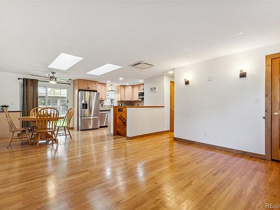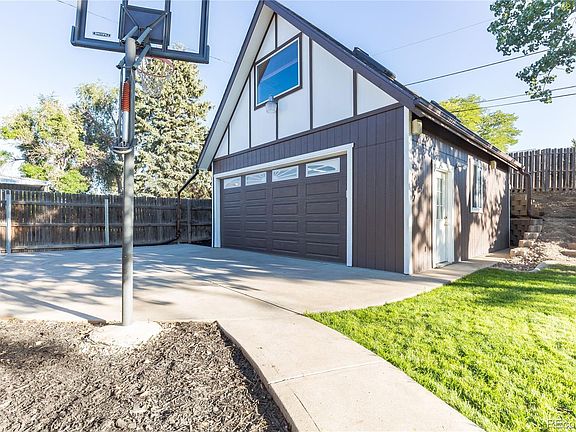 This cute ranch home is nestled in a great neighborhood and boasts many wonderful features. Enjoy a warm & homey feel the moment you walk through the front door past the bright bay window, & into the open floor plan. An updated kitchen invites you to enjoy a ton of natural light which flows through the north facing window and skylights; brightening up the entire main level. The kitchen has stainless steel appliances, granite counters, a farm sink, and a gas cooktop. Open up the sliding glass door from your dining space to a beautiful covered patio which includes additional sky lights & ceiling fans for spectacular indoor/outdoor entertainment, and golf course/mountain views. Two bedrooms and two bathrooms can be found on the main level with a large Primary Bedroom accommodating for an office, reading, or workout space. Head to the basement for another bedroom, bathroom, and a huge family room allowing for many room configurations and uses. In addition to RV driveway space, an oversized attached garage w/storage room, is a most spectacular detached garage. This garage is a car lover's dream! It's a finished, heated, & well-lit workshop with newly epoxied floors, & includes a staircase lift to access a bonus room upstairs! Envision an ultimate man-cave, she-shed, private office, a teenager's living space, or a poker room. This room is a finished space, with a heating and cooling unit, ample storage, & a ton of windows. Enjoy the wonderful outdoor living space with mature trees, a peach tree, a peaceful water feature, and lots of entertainment space. The seller installed mini-split heating and cooling units throughout the house for added comfort all year long as well as a high efficiency boiler system & steam humidifier. A motorized gate provides an even more secure lot. Restaurants, Indian Tree Golf Course, & Sprouts Farmers Market are in walking distance. Drive to Olde Town Arvada, I-70, & Hwy 36 in minutes for great mountain access, & a 20 minute drive Downtown.