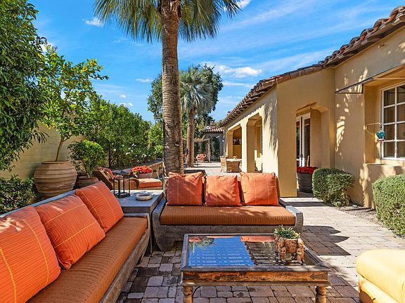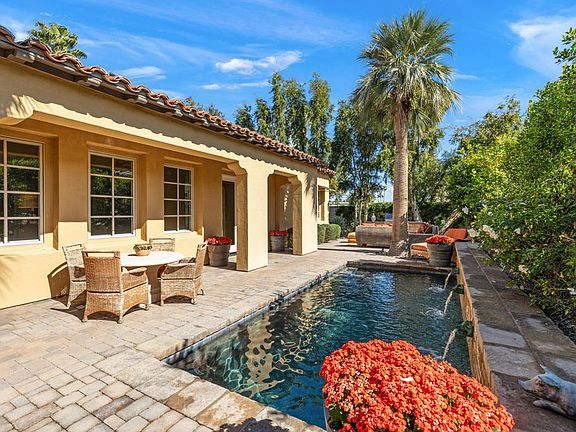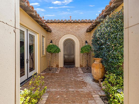 Beautiful and updated home on a prime south-facing corner lot in the highly desirable and gated neighborhood of The Province. Updates include a completely remodeled primary bathroom with floor-to-ceiling porcelain tiles, new bathroom countertops, a spacious new shower, new closets, plus new carpet and paint. All bathrooms have been updated as well as lush landscaping upgrades with privacy Ficus trees and greenery covering the border walls. Spacious open floorplan with a separate formal dining room showcasing a newly added bar and buffet. The kitchen features include a separate butler's kitchen, a modern double oven, a built-in refrigerator/freezer, a 6-burner Viking range, an oversized wine refrigerator, a separate beverage center, two kitchen sinks, and a walk-in pantry. The two guest bedrooms have ensuite bathrooms and are located on the opposite side of the house from the primary bedroom. The south-facing back patio is sunny and bright, with French doors leading out to the paver hardscape. Patio highlights include a dipping pool with waterfalls, a spa off the primary bedroom, and a built-in Viking BBQ. The garage is immaculate and air-conditioned, with room for two cars and two golf carts plus generous storage. The house is equipped with leased solar which is transferrable and is also equipped with a video surveillance system.