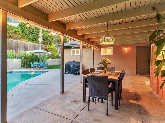 Nestled in the desirable San Carlos neighborhood, this beautiful 4-bedroom, 2-bathroom home offers the perfect blend of comfort and outdoor living. The home features engineered hardwood floors throughout, bringing warmth to every room. The kitchen, a true focal point of the house, showcases sleek white cabinetry, quartz countertops, and premium stainless-steel appliances—perfect for both casual meals and entertaining guests. Just minutes from Cowles Mountain and scenic hiking trails, the property boasts a lush backyard oasis featuring a sparkling pool surrounded by vibrant foliage, including avocado, lemon, and lime trees, fragrant plumeria and rosemary, blooming hibiscus, and elegant Boston ivy. With owned solar panels for energy efficiency and lower utility costs, and located in a welcoming community, this home is an ideal retreat for those who love nature and a vibrant neighborhood atmosphere.