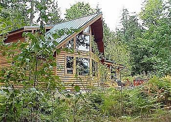 This is a Lindall cedar home with log siding, stamped concrete patio, metal roof, and extensive cedar throughout. Solid wood cabinets, two walk in closets, jetted tub downstairs, huge double-headed tile shower in upstairs. Large rock gas fireplace and engineered wood flooring throughout. Large yard with a garden with lots of sun. Exceptionally private.