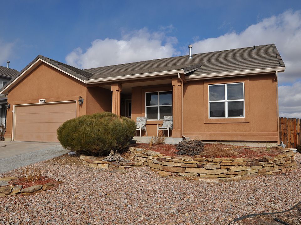 STUCCO RANCHER WITH MAIN-LEVEL LIVING AND WALK-OUT BASEMENT AWAITS YOU! Southwest facing! Open space behind! Lovely xeriscaped front yard, HUGE fenced back yard with lots of grass, oversize patio, auto sprinkler and storage shed with electric! MAIN FLOOR OFFERS: open floor plan, great room with vaulted ceiling, gas fireplace and decorative ledge; spacious kitchen with plenty of cabinets, recessed lighting, pantry, black appliances, breakfast bar and tile counter tops; separate dining area with bay window; large master suite features a walk-in closet and adjoining 5-pc bath with soaking tub; two secondary bedrooms; full bath; and laundry room! WALK-OUT BASEMENT INCLUDES a HUGE family room with walk-out access to an awesome back yard, two more very large bedrooms, 3/4 bathroom and an unfinished storage area! Other features include: newer central air conditioning (2012), 50-gallon water heater, water softener, security system, tile roof, 6-panel doors, covered front porch, prewired for hot tub! Conveniently located minutes from Fort Carson, shopping, restaurants and I-25!