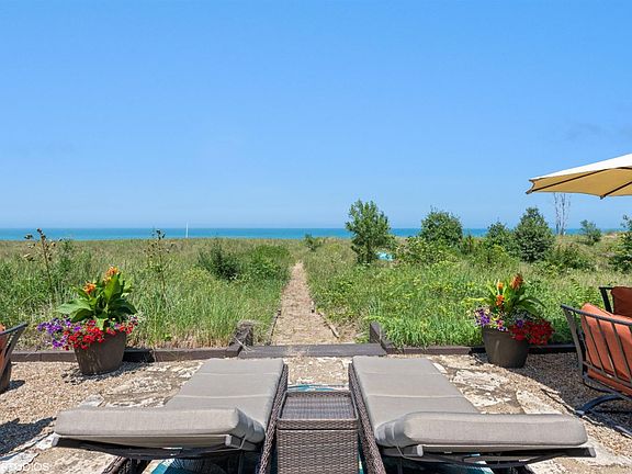 LAKE MICHIGAN FRONTAGE- EXTREMELY RARE! A designer & architect came together to reimagine this classic beach house. What a vision they had. This warm & inviting home , though updated, has kept some of its original charm. The main floor has beautiful travertine floors, custom pine doors, a mix of metal, wood & stone. It hosts the lakeview kitchen & formal dining, family room, pantry cabinets & finished laundry room with full bath. The upper floor living room has lakeviews, brick fireplace, reclaimed barnwood walls & beamed ceiling. There are also 3 bedrooms & a full bath. The garage is attached via a breezeway & has both heat & air. The beautifully landscaped yard is terraced to provide multi-purpose living. The top level has a patio perfect for grilling and hosting outdoor dinner parties. There is a bocce ball court, a grassy level great for pets & the lower entertaining area - perfect for watching the sunset over Lake Michigan or follow your own path to the beach.