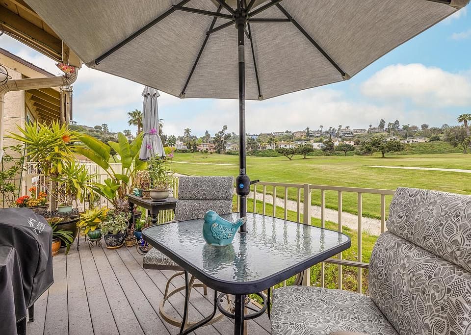 PRIME LOCATION! Step into the ultimate living experience, overlooking the Omni Resort Par 5 golf course. This rarely available floorplan offers countless features that are not to be missed. The spacious main patio provides a relaxing space for entertaining and relaxing, while enjoying picturesque views. The newly remodeled open concept kitchen showcases its personality with a unique backsplash, and is equipped with top of the line LG stainless steel dishwasher, electric cooktop/oven and microwave. Also included are quartz countertops with a 52” x 90” island, maple cabinetry, oven hood, ample drawer space, pantry, and recessed lighting. Kitchen design was honored by Diamond Custom Cabinet Company. Modern style ceiling fans, dual pane windows and shutters are featured throughout. Accents such as stained glass, crown molding, custom exterior and interior doors and new wrought iron along top of the staircase reflect pride of ownership and attention to detail in this sophisticated home. Primary bedroom features a sleek sliding closet door, and bathroom has gorgeous travertine flooring, and brand new shower tile and fixtures. Additional space adjacent to second floor primary bedroom can be used as a nursery, guest space for one, office, playroom, or library. The first floor offers an additional separate living space, bedroom, full bathroom, kitchenette, and private tranquil patio overlooking the golf course. Two car attached garage and additional parking available. Newer high tech washer and dryer, and newly installed insulation is rated for increased energy savings. HOA covers trash, building insurance and patio, deck railing and roof. NO Mello Roos. Highly rated schools nearby, and enjoy delicious eateries, shopping and Cinepolis Luxury Cinemas just over one mile away at La Costa Town Square.