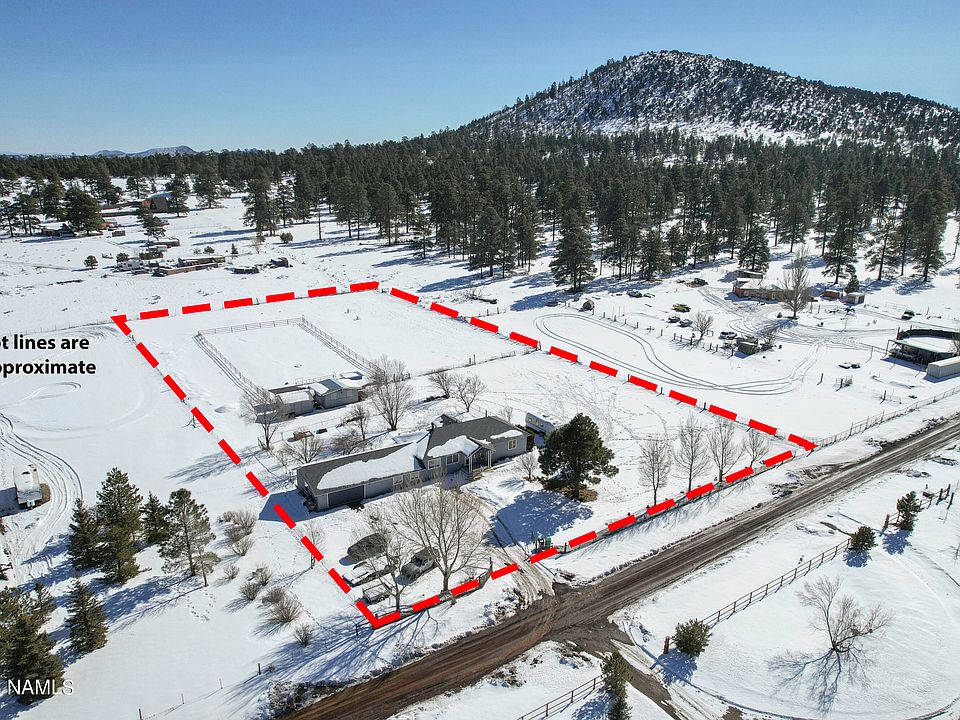 Unbeatable location for the money - this 4 bedroom/2 bathroom w/ office space, ranch home borders National Forest land & sits on 2.5 acres. Your own gate opens to an enormous wilderness playground. No HOA. Imagine the possibilities. Wake up to breathtaking mountain views. Two horse stables, fully fenced backyard, with your own gate to National Forest. New roof, has A/C, upgraded appliances, & fresh paint throughout. Just under a 5 mile drive to Flagstaff Mall & under 10 to downtown. Original garage was converted to primary bedroom, bath, & huge closet.