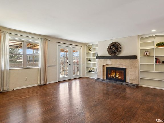 The heart of the home showcases a spacious living area adorned with a cozy fireplace and custom built-ins, flowing seamlessly onto a welcoming back deck. The primary suite stands out with elegant oak flooring and French doors that open to outdoor living space, creating a perfect retreat. Iwo additional bedrooms share generously sized bathroom, providing comfortable accommodations for family or quests. A second fireplace in the family room adds extra warmth and ambiance during Colorado's cooler months.