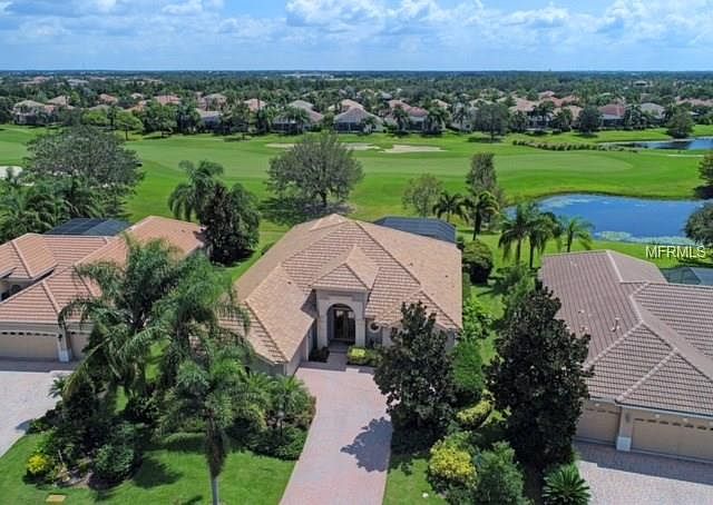 Enjoy serene Lake and Golf Course views from this expanded custom Gibraltor home. More exquisite than a Builder's model, featuring a beautiful light filled versatile floor plan. As you enter thru the double glass doors you appreciate the captivating high ceiling details and double crown moldings. Your gaze follows to the outdoor lanai with heated resort style pool and spa. The outdoor kitchen is perfect for entertaining with a dining area with ample room for conversation seating and relaxing by the cozy fireplace to enjoy fabulous southern water views. Enjoy cooking in the expansive lite filled Chef's Kitchen with solid wood cabinets, granite, upgraded appliances , dining area with large aquarium window and Family room with disappearing pocket doors uniting the indoor and outdoor space. The additional versatile floor plan can be used as a Living room plus separate dining room or study. Retreat to the Master suite with direct access to the pool and spa. The large master bath has a soaking tub, walk-in shower and separate vanities. The 2nd bedroom has an in-suite bath, the large 3rd bedroom has built-ins and adjacent bath. A Full Pool bath with shower is accessible from the home or pool. A True Luxury Retreat nestled on a quiet cul da sac in a maintenance -free community within the gates of Lakewood Ranch Country. Located close to Lakewood Ranch Main St. and all that it offers, the new UTC Mall, Benderson Park, Medical facilities and Minutes from World class Beaches.