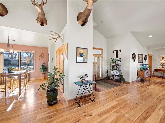 Gorgeous ranch-style home on 35 acres with irrigation water and high-quality craftsmanship throughout. Enjoy hickory hardwood floors, custom hickory cabinetry, tongue-and-groove ceilings inside and out, and both indoor and outdoor wood-burning fireplaces. The gourmet kitchen features Wolfe and Sub-Zero appliances and is designed for both cooking and entertaining. Reverse osmosis system is installed and included for you too!The property is a true standout with 12 shares of UVWUA irrigation water, producing approximately 10 acres of hay each year. Property includes pole barn, storage building and chicken coop ideal for equipment, toys, and animals. Two ponds on site stocked with fish, and the river running through the property give you year round fishing - literally in your own back yard! Sweeping mountain views create an unmatched, private Western Colorado setting.