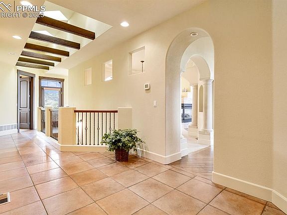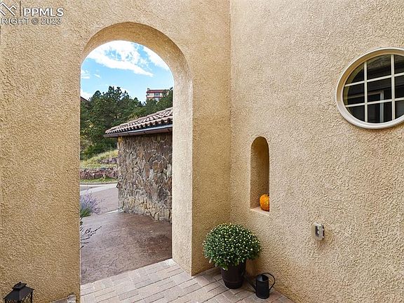This wonderful Italian Villa-inspired home sits high on a corner lot in The Sanctuary at Peregrine. A quaint courtyard style entry welcomes you into a tiled foyer, gazing down an open-beamed hallway filled with skylights and natural light. Another small vestibule leads to the garage and laundry room, and down the hall sits a bright office with it's own french door entrance into the courtyard area at the front door. High ceilings, tall elegant windows, & city views are perfect in this private at-home office. Entering into the kitchen and dining areas feels a bit magical as all of the rooms flow to the next with an open floor plan, yet they are separate and defined areas. Stunning beam work with custom window layouts above the kitchen, and the kitchen is equipped with a double oven, downdraft range top, reverse osmosis water system, and slab granite countertops. The living room is graced with grand window layouts, architectural beam work, and french doors to a beautiful Loggia with outdoor fireplace. All of this with sweeping views of both mountains and city, you can entertain with ease. There's a separate formal dining area with columns and display niches, as well as an informal dining nook with french doors leading to it's own Juliette balcony (panoramic city lights!). The living and dining areas glow in the warmth of a glass 3-sided fireplace, and for additional thematic decor and ambience there is a candelabra fireplace with a timber mantle in the Great Room. The owner's suite includes a 5 piece bath, high beamed ceilings, and a private door to yet another deck with fantastic views. Downstairs you will find a large family room, wet bar, built in entertainment/display niches, sliding glass door to a private patio, and another 3-sided fireplace that warms the entertaining spaces well. There are 3 bedrooms downstairs, a full bath, a 2nd office/library room, and a huge storage room. Call to arrange your private tour today, let The Sanctuary welcome you home.