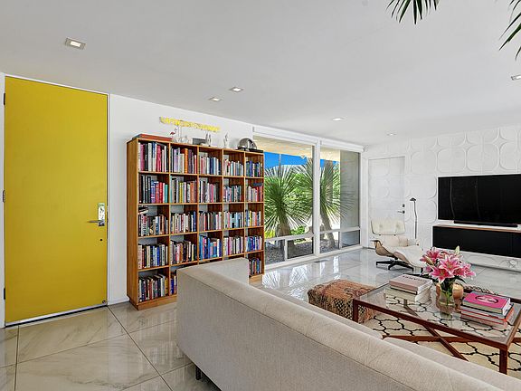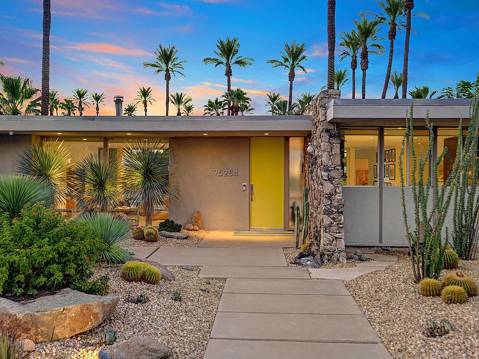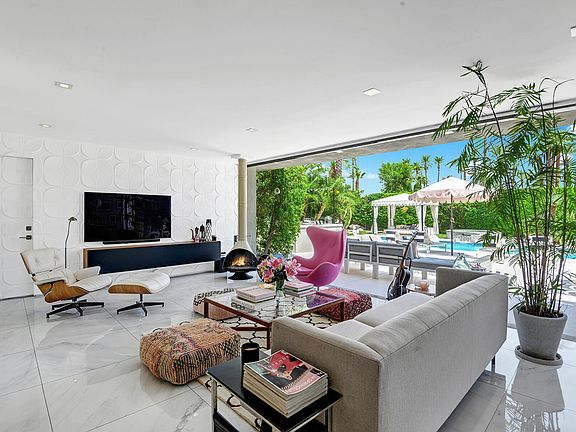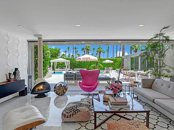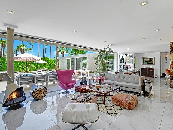 Lifestyle for sale. Seriously. This absolutely unique 1962 Mid-Century Modern bungalow in the heart of desirable Indian Wells has been extensively remodeled with new everything (windows, electrical, plumbing) along with amenities and design appointments for the most discerning. The effortless, relaxed, luxurious vibe of this spectacular property is like no other. The defining feature of the remarkable indoor/outdoor open plan of this one-of-a-kind gem is a 30 foot disappearing sliding glass wall that creates a seamless extension of home to the breathtaking private backyard that was completely redone in 2020 - new pool, spa addition, fixed cabaña, outdoor bar, outdoor shower, fire pit and all new concrete glazed with cool decking which makes the entire surface barefoot and pet friendly on even the hottest desert days. Custom landscaping, a shuffleboard court, a small raised bed vegetable garden, panoramic palm and mountain views cap the long list of amazing features of this outdoor space. Floors throughout this home gleam with oversized white Calcutta marble style porcelain tiles that provide magnificent balance to the clean architectural lines. A recent (fully permitted) addition off the master bedroom showcases an epic closet and new en-suite. Sleek, perfectly appointed kitchen, malm fireplace... everything about this home speaks to an easy, relaxed SoCal lifestyle. Offered furnished. An entertainers dream, your perfect desert home, just a five minute drive to El Paseo.
