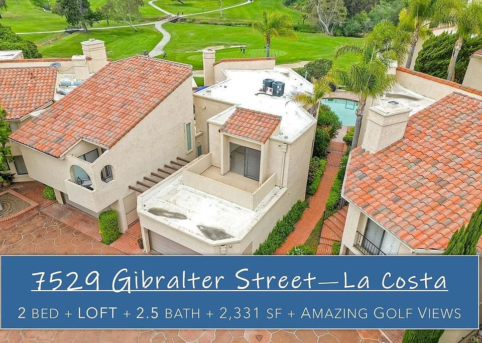 Welcome to 7529 Gibraltar Street which is situated on a stunning West-Facing lot with panoramic VIEWS of Omni La Costa's "Legends/South" golf course ** 1st time ever on market & townhomes of this size are rare in this area ** The spacious 2,331 sq ft flowing floorplan features: Primary MBR downstairs + upstairs JR Master suite + 2.5 Bath + large LOFT (currently an office or could convert into 3rd bed) + 1 Patio & 2 Private Balconies ** CORNER-END unit sharing only 1 wall ** The TWO CAR garage has direct access into the kitchen (full size laundry closet inside as well) ** Views out over the lush 14th green from most windows, including the MBR & upstairs LOFT ** The Roundtree complex is comprised of two separately GATED motor-courtyards of 8 unique attached residences that are connected by the POOL/SPA & BBQ terrace ** All this conveniently located within minutes of ENC / SAN DIEGUITO schools, La Costa Town Square, restaurants, the Omni LC Resort, trails & only 4 miles from the BEACH or downtown Encinitas