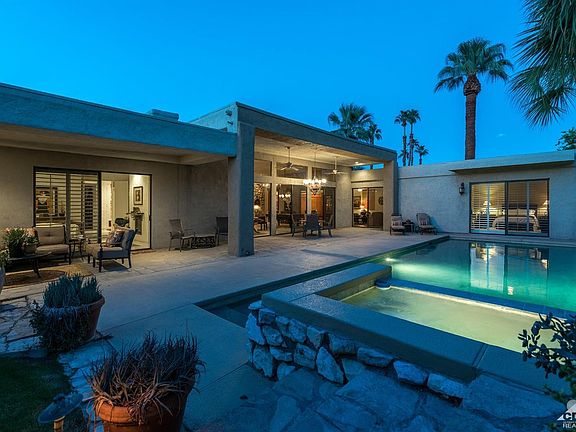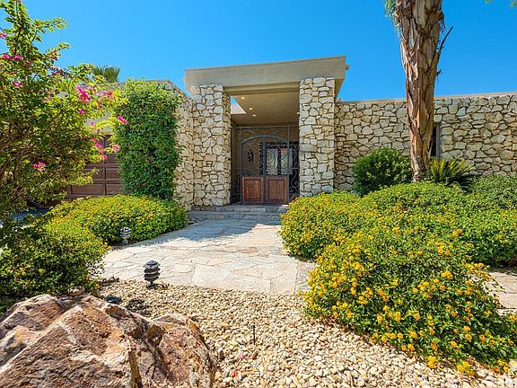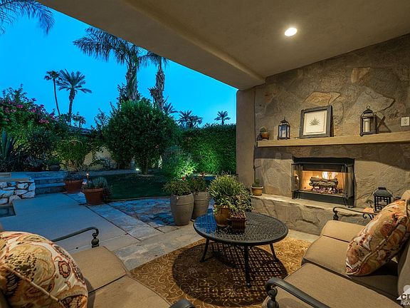 An outstanding custom home with character and No HOA Dues! The formal entry overlooks a Grand 37'x 27'room with walls of windows viewing the South Santa Rosa Mountains and a true swimmers pool with spa. A covered patio runs the length of the home and enjoys an outdoor fireplace. Expansive rooms with 12' high ceilings are featured throughout. Rocky Mountain Quartz walls surround a double sided fireplace in the Grand Room with Quartz columns and stone or Terrazzo flooring accented by Mahogany doors and trim throughout. The adjacent Kitchen opens to a large Family room and the Mahogany kitchen walls are doors that open to feature small appliance counters and pantry storage. 3 King-size bedrooms are en-suite and one off the family room adds Casita-like privacy. An office or 4th bedroom has built in bookcases and is adjacent to a storage room that could be a wine cellar. This unique home of remarkable design and execution can easily transition in style with just a change of furnishings.