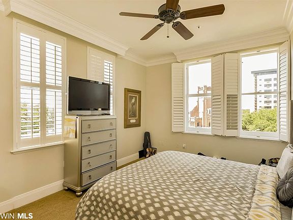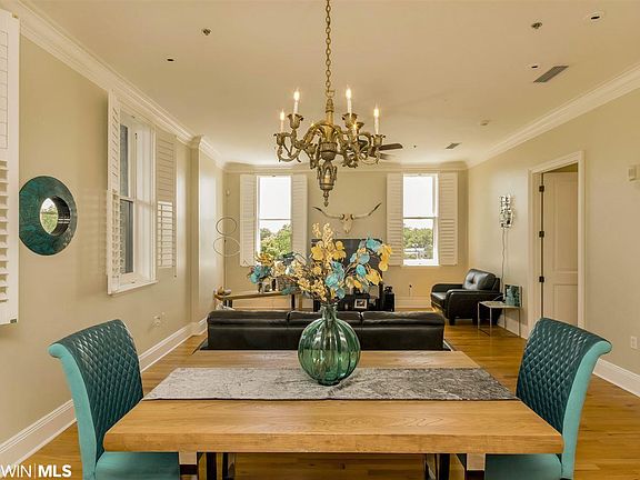 Historic Downtown Mobile. This is the Large one bedroom, unit plan with loads of amenities and on the Mardi Gras route. There is a great view of the parades from this unit. Back balcony offers a view of Downtown Mobile as well as the pool and patio areas. Hardwood floors, recessed lighting, stainless appliances, granite countertops. Lots of kitchen cabinets. High ceilings. Open kitchen, dining, living area opens to back balcony. Common area amenities include: Weight Rm, Cardio Rm, large Rec Rm, Kitchen, Dining Rm, extra storage for each unit. Common area is great for entertaining large groups. Complex is totally gated. Comes with covered carport #6. Carport has a large storage closet. Condo fee is 487.00 per month. Dining Area Chandelier and Mirror in Entrance Reserved. Square Footage taken from Condo Docs. Rental Restrictions: 1 year minimum lease, no pets for renters. Property tax will be cut in half with claiming homestead.