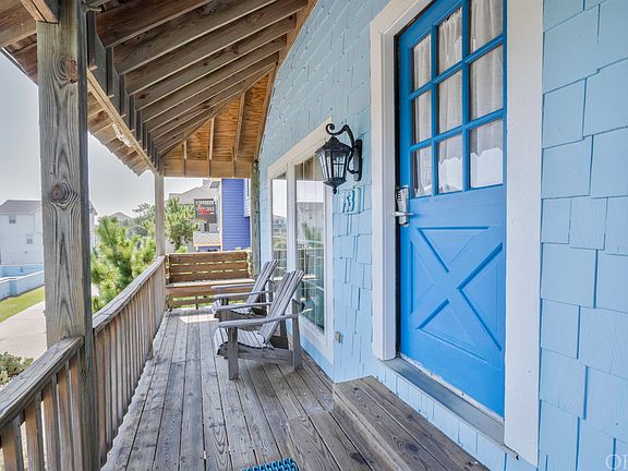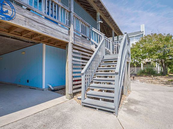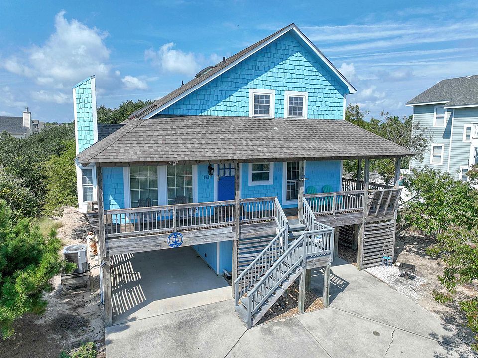 All aboard the SS Tranquility! Classic Outer Banks nautical-style home with serene sky-blue cedar shake and exposed soffit beam exterior. Interior is reminiscent of ship's timbers yet light-filled by skylights. Seafaring and cottage-charm decor balanced by modern touches in updated kitchen, baths and flooring... and awesome 33.5x13 PRIVATE POOL! Huge biggie is the FORTIFIED ROOF installed in 2019! Also HVAC 2020, Bathrooms 2016, Mid-level flooring 2022, and Exterior painted in fall 2023! Plenty of space to stretch out with top-level loft/sitting area, and conditioned-space game room with futon and mini-fridge on ground level which leads into laundry room and private storage. 3/4 wrap deck for sun or shade any time of day. Lots of carport parking and outdoor shower just off pool area. Nice Section M cul-de-sac is just off Driftwood Way, and about mid-way from Ocean Trail to the Beach Access walkway off Spinnaker Arch.
