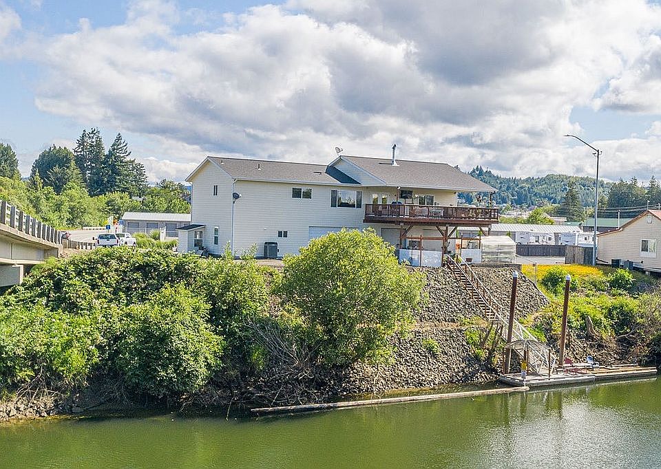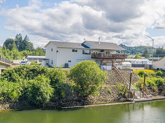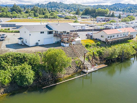 Coquille riverfront property for sale! Gorgeous residence above with open floor plan and vaulted, granite kitchen with custom cabs and huge pantry, master suite w/ walk in closet and sliders to upper covered deck - complete with hot tub and surround sound audio. Lower level has 1 bedroom apartment, 2 tandem storage units and double garage. Lower patio area leads to dock! Tons of parking options including RV hook-ups! Excellent live/work set-up or use as a river retreat that pays for itself! Must see property!