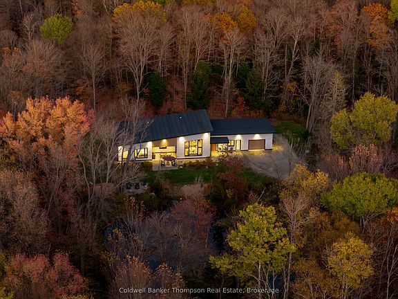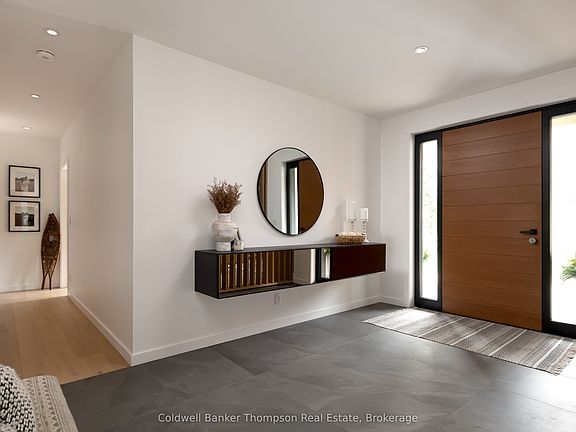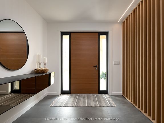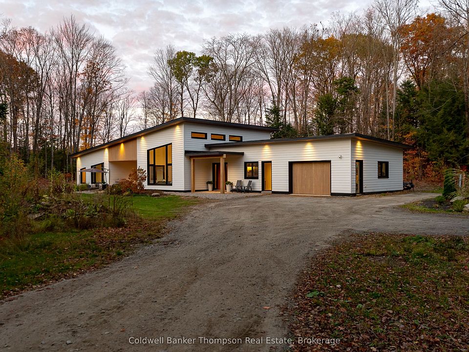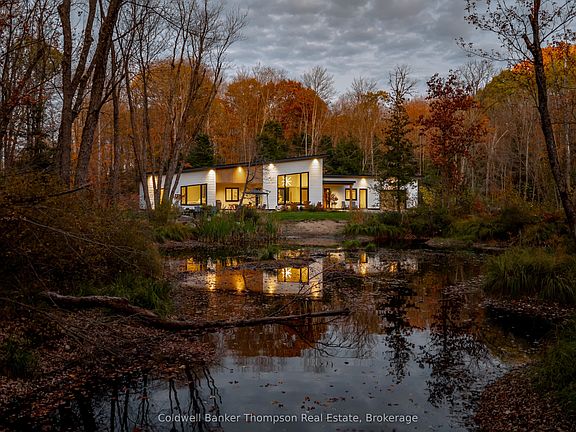 Curated by Thyme Design, renowned for creating healthy living spaces using sustainable practices that reflect Muskoka living & a refined northern aesthetic, this exceptional 3-bed, 2.5-bath bungalow embodies elevated modern luxury. Set on 2.6 acres with 260ft of frontage on a year-round municipally maintained road, the home sits toward the rear of the lot, approached by a meandering driveway offering great privacy. A spacious foyer with a striking wood fluted accent wall opens into the heart of the home, an expansive open-concept living, dining & kitchen area where wood-accented soaring ceilings & warm natural textures create a space both inviting & architecturally striking. The living room opens to a private patio, while the dining area features an elegant bar with dual beverage fridges. The chef's kitchen impresses with a massive island, premium SS appliances & a walk-through butler's pantry connecting to the mudroom, laundry & heated garage. The primary suite features 2 walk-in closets, a wall of west-facing windows & a spa-like 6-pc ensuite with double vanities, a soaker tub & a modern flush double shower. Two additional bedrooms share a stylish 5-pc guest bath. A versatile bonus room with an alcove entry provides extra family space, while a private office with exterior access & 2-pc powder room is ideal for working from home. Attention to detail continues with in-floor heating throughout the home & garage, a hidden 200 sq ft storage room above the kitchen with up to 8-ft ceilings, energy-efficient triple-pane wood aluminum-clad windows from Poland, added insulation, a solar-panel-ready roof, built-in speakers & an impressive suite of smart home features including a Sense Energy Monitoring System, Lutron Caseta switches, Ubiquiti networking, WiFi enabled garage door controller, WiFi controlled in-floor heating & a Dana smart lock. A masterful blend of design integrity, modern comfort & sustainable elegance, this home defines contemporary Muskoka living.
