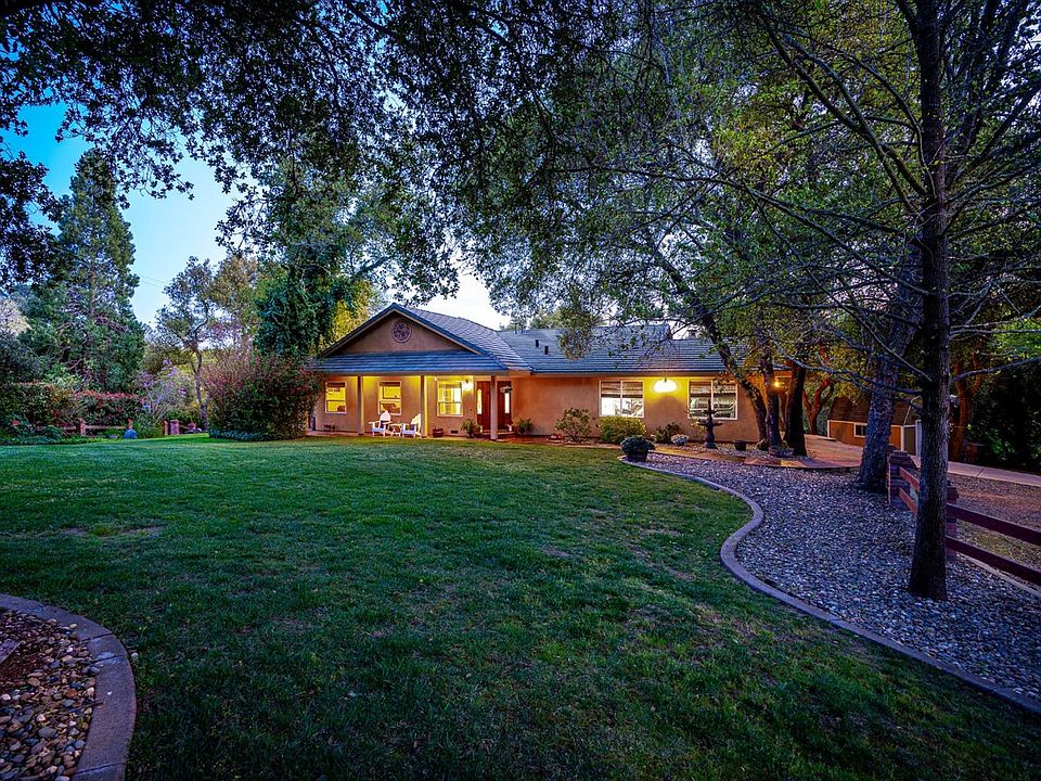 A perfectly placed home. This property set on a shady private driveway, sitting on 1.5 acres of mature trees & lichen covered rock outcroppings; is a beautiful family inspired residence. It includes 3 bedrooms 2 bathrooms, 2784 square feet of living space in contemporary ranch details. This space includes a private office, formal living, family room, laundry room, 2 fireplaces, pool/spa, workshop, & play fort/she shed. This recently remodeled home has tile & carpet floors throughout. A chef's kitchen awaits with spacious granite counters, 2 wine refrigerators, warming drawer, gas range, & stainless steel appliances. The master bedroom has a warm fireplace, his/hers closets. The impressive pool & spa with outdoor living space has an outdoor kitchen. Top quality abounds in this property with Trex decking, a large workshop, 220 power, RV hook up, garden beds & fruit trees, a barn, play house/she shed. This spacious private family compound is delightful. Room for family and outdoor fun!!!