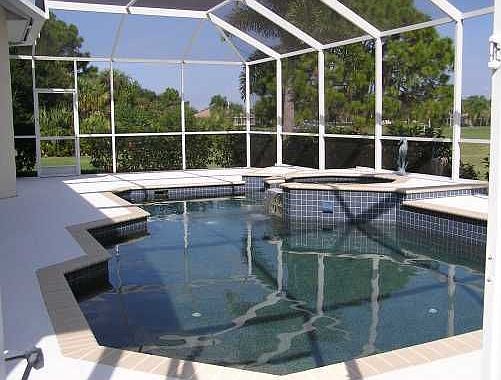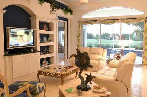 Location! Location! Exceptional view of the golf course and lake. Light,bright interior. Maintenance free home with a salt water pool,new screening, gas heater and pool pump. Mature landscaping, double door entry, third bedroom is a den, jetted tub in the master bath, sunny breakfast nook, built-in laundry tub, and newer carpet in the bedrooms and great room. Private guest suite with a pocket door. The view is a one of a kind.