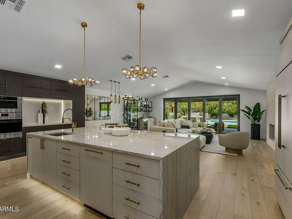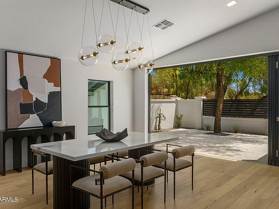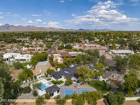 In the heart of Scottsdale, this 5 bedroom, 4.5 bath has been completely re-imagined by a published designer. Sitting on a nearly an acre, the main house boasts a large primary bedroom facing the back yard w/ an exceptional spa-like, en-suite bath. Walk in shower has a trio of heads w/ deep soaking tub & sliding doors to a private, outdoor shower. His / her closets w/ morning bar & fridge to start your day. Designer lighting abounds throughout the home. Large kitchen equipped w/ walk in pantry, Sub Zero / Wolf appliances, 2 sinks, & beautiful quartz counters. There are 3 additional, spacious bedrooms in the main house. Stunning separate casita fully equipped with all appliances, washer / dryer. Huge yard, new ramada w/ fireplace, & new pickleball court round out this modern masterpiece.