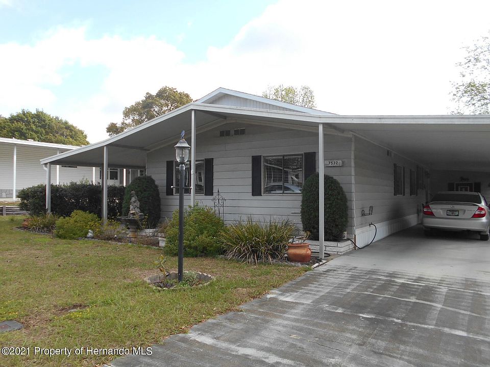 ACTIVE WITH CONTRACT Beautiful three bedroom two bath split plan two carport, wood burning fireplace, laminated floors,, newer AC open floor plan, eat in kitchen and a formal dining room, this home has been well maintained shows pride ownership, come and enjoy the Florida living in a 55 plus community where you own your own land for $45 on a single lot