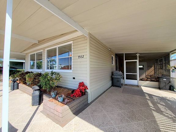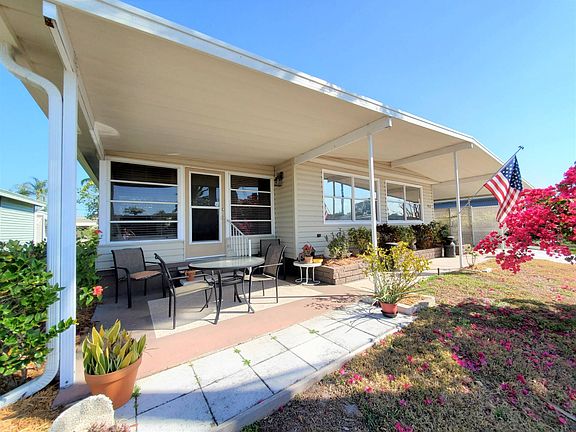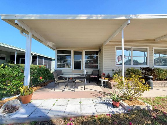 Just Listed $65,900 Turnkey If you are in search of a Turnkey, Updated, Move-in ready home.....look no further! This home does not disappoint! Beautiful curb appeal with front palm trees and a stunning bougainvillea bush that is in full bloom. The front of the home has a covered patio area with an outdoor table set. Cozy area to relax and have your lunch while you watch your neighbors go by. There is a side driveway, carport, screened patio area and a large storage shed. The patio has a ceiling fan and a nice sitting area. Washer and dryer are located in the storge shed, that also hosts a wet sink, refrigerator, and shelving. Plenty of room for your tools, beach gear and bikes. Stepping inside you enter the open floor plan kitchen and living room. The kitchen has updated cabinets, countertops, black appliances and lighting. The center island is massive with a wet bar sink. Plenty of room to prepare your meals and entertain your guests. There is no shortage of cabinet and counterspace. Lovely large living room that opens up to the side enclosed air-conditioned Florida room. This room is currently being used as a second living room/office. The guest bedroom accommodates a Full-sized bed comfortably with a double mirrored closet. Spacious guest bathroom with a step-in shower and a large vanity with storage underneath. Master bedroom is large with a queen-sized bed, night stands and a huge walk-in closet. The ensuite bathroom has a linen closet, new vanity with cabinets and drawers and a step-in tiled shower. Vapor barrier was replaced in 2015, Tie downs 2018, and the AC/ductwork 2017. Roof is metal and has been recoated. This home will not last long....Call today!! Colony Cove is an age qualified (55+) five-star resort community of manufactured / mobile homes. The "Cove" boasts 5 clubhouses, 5 heated pools, a riverfront pavilion and private fishing pier, a private marina, a fenced dog park (very pet friendly), tennis, shuffleboard, new pickleball courts, 2 new fitness rooms, 24-hour patrol, clubs for every interest, and much more. There are daily planned activities throughout the park. Bottom line, if you get bored here, it's your own fault!! The lot rent in Colony Cove is based on the homes' location. While the monthly rent may not be the lowest around, it's by far the best value for the money. Not only does the monthly rent cover all of the amenities of the community listed above, it also covers almost all other monthly expenses such as; water, sewer, trash pickup, all property taxes, lawn maintenance. . .pretty much every monthly expense except electricity and internet. The current lot rent on this home is estimated at $982.19 per month. All listing information given to us is considered appropriate and reliable but always recommend Home Inspections by independent companies who have a background and thorough understanding of manufactured homes. We cannot guarantee the accuracy of information given to us or the condition of the home. Lot rents are determined by the community office not our company.