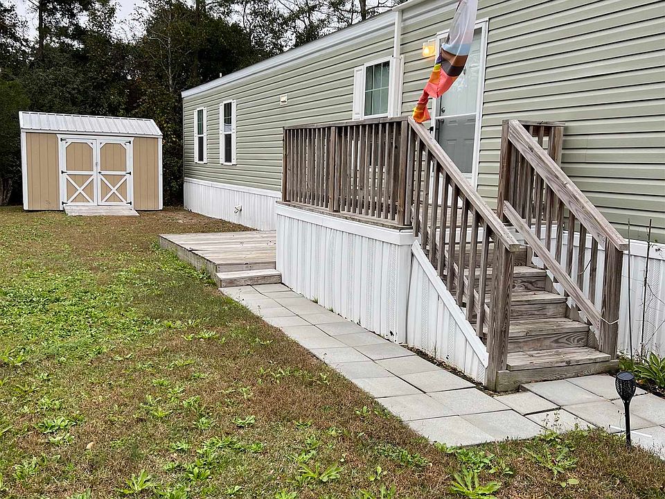 Like New 2 bedroom 2 bath 2018 Fleetwood single wide mobile home in a prime location! This great home has an open concept living space with light grey laminate flooring throughout the space. The living room features a convent work area with upper and lower cabinets and a built in desk. In the kitchen you will find a breakfast bar and a dining area as well. The big master bedroom has a walk in closet, ceiling fan, and double doors that take you into the master bath. The master bath has a glass enclosed walk-in shower, a single sink on along vanity with good storage space and a bench seat with extra storage as well! The split bedroom plan has the second bedroom at the other end of the home; this bedroom also has a walk in closet and ceiling fan. There is also a second full bathroom with a shower/tub combo as well as a separate laundry area as well plus the washer and dryer come with the home! Outside there is a front and back porch as well as a large deck perfect for grilling out! This home also comes with a big detached storage shed with double doors and reinforced floors that can support a lawnmower, a motorcycle, golf cart, or ATV plus its great storage space! Located in the quiet neighborhood Olde Mill Mobile Home Community on leased land. This ideal location off of HWY 707 is close to both St. James and Socastee schools plus you can quickly get to HWY 544 or HWY31 making traveling across the Grand Strand a breeze!